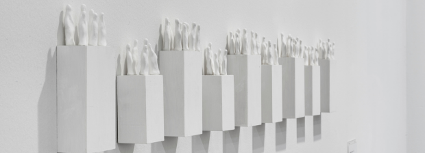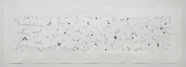 Eigens für den Projektraum des Kunstmuseums Singen, inmitten in der Ausstellung ihrer Großeltern, hat Véronique Verdet eine neue filigrane, dabei großformatige Cluster-Zeichnung aus ihrer Serie »Fouloscopie« realisiert, die sie mit weiteren Zeichnungen und Miniaturfiguren in Kästen kombiniert.