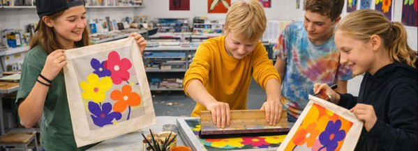 Ausgehend von den reduzierten, farbintensiven Blumenmotiven von Markus Weggenmann und mit Blick auf Andy Warhol, dem »Vater« des künstlerischen Siebdrucks, entwickeln wir eigene abstrakte Flower-Motive. Wir arbeiten mit klaren Formen, starken Farben und bewusster Vereinfachung – und merken schnell, wie viel Ausdruck in wenigen Linien und Flächen stecken kann. Dann geht es an den Druck: Schritt für Schritt entsteht ein tragbares Kunstwerk, jedes Stück ein Unikat.